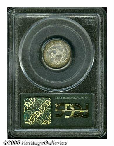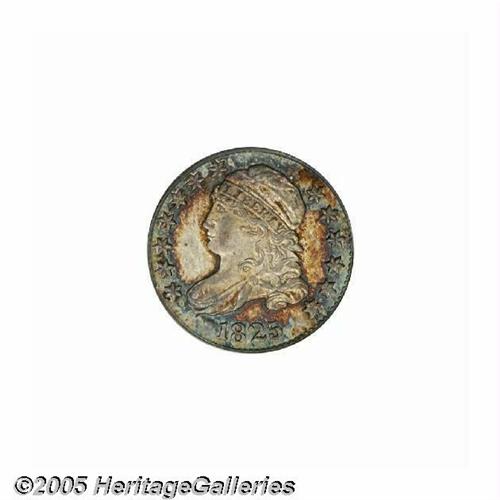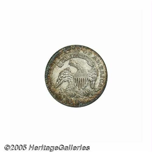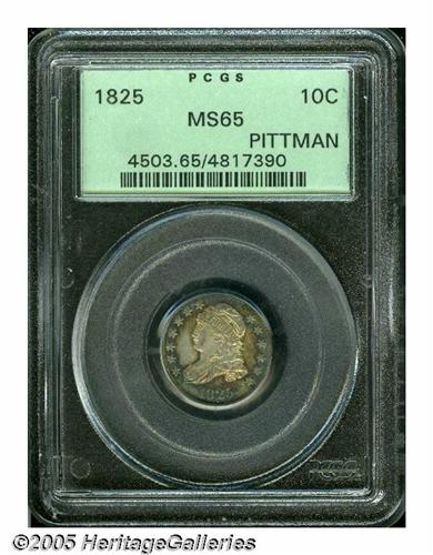 <B>1825<10C> MS65 PCGS.</B></I> JR-4, R.2. Ex: Pittman. Beautiful golden-brown and forest-green colors bathe this unmarked Gem. The fields are decidedly prooflike, although not designated as such on the older green label insert. Well struck on the peripheral elements such as the stars, while the major devices are nicely struck up although not razor-sharp. Technically among the finest 1825 Dimes, but perhaps unimprovable from an aesthetic perspective. Population: 2 in 65, 4 finer (6/05).<BR><I>Ex: John J. Pittman Collection, Part One (Akers, 10/97), lot 556, which realized $6,600.</B></I>