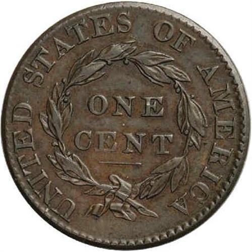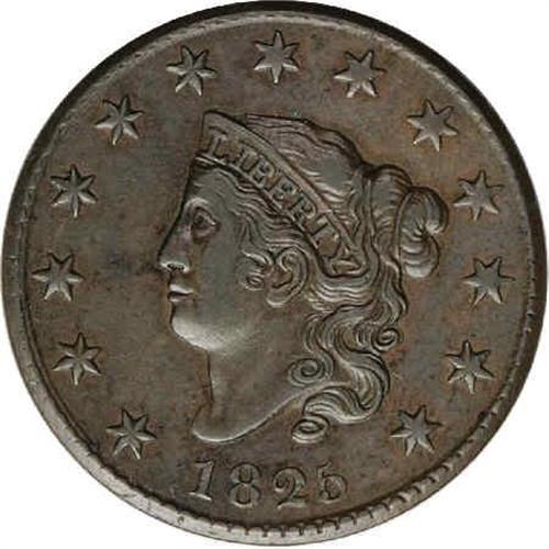 <B>1825<1C> N-8, R.3. AU55 NGC. VF30 EAC.</B></I> Middle Die State. A faint crack extends from the upper tip of the Coronet through the left side of star 6 to the rim. Even medium brown glossy toning adheres to each side, and well centered devices are sharply impressed, though the stars along the upper and right (facing) border are soft in the centers. The surfaces are remarkably clean on both obverse and reverse; a minute mark under Liberty's eye will help to pedigree this coin. An overall attractive specimen.<BR><I>Ex: George Ramont (12/1972).</B></I> Envelope Included.