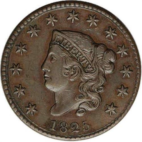 <B>1825<1C> N-9, High R.2. AU55 NGC. VF30 EAC.</B></I> Early Die State. A small square below the T in CENT attributes the variety. The obverse inner circle is nearly complete, being interrupted only from 2 to 4 o'clock. Chestnut-brown surfaces display a semi-gloss sheen. The design features are almost perfectly centered and boldly defined, except for minor softness in portions of Liberty's hair, especially at the forehead and temple. A few minor contact marks over each side do not distract, and one on Liberty's neck may serve to identify the specimen.<BR><I>Ex: Raymond Gallo (10/1/1968).</B></I> Envelope Included.
