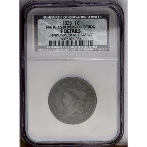 <B>1825<1C> N-6, R.3--Environmental Damage--NCS. Fine Details. Good 6 EAC.</B></I> N-6, Early Die State, R.3. Liberty's face displays a triple profile. Medium to dark brown surfaces are lightly porous. A few minute contact marks occur in the reverse center, and the reverse is rotated about 20 degrees.<BR><I>Ex: Barker (3/18/1972).</B></I> Envelope Included.