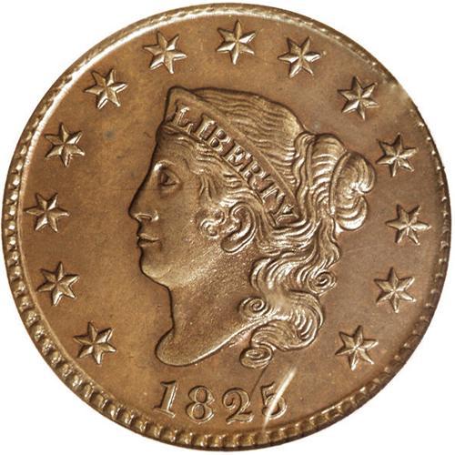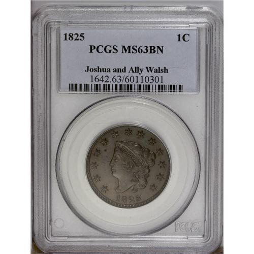 <B>1825<1C> MS63 Brown PCGS.</B></I> N-9, High R.2. Ex: Joshua and Ally Walsh. Delightfully well struck, with echoes of mint red still clinging. A bit of die rust is visible on the portrait, and slight die erosion on the reverse. The strike is a bit off center. PCGS has graded five finer of the date (3/06). EAC 55. <BR><BR><B>Important notice:</B> Heritage usually auctions material at the rate of 200-250 lots per hour. On some occasions eBay Live bid software or the Internet may not be able to keep up with the pace of the auction. We recommend placing a realistic absentee bid now as insurance to avoid disappointment. Occasionally the auctioneer may eliminate or reject an eBay Live bid, and the auctioneer may also reopen a lot after the close of the eBay live bidding (usually because we missed an audience bid), and may reject your bid even if it shows you as the winning bidder. By bidding via eBay Live, you agree that Heritage may award the lot to another bidder at its sole discretion under the circumstances described above or any other reasonable circumstances. Since eBay bids are not shown to us until we open the lot on the floor, we treat those bids just like floor bids. In most cases the floor responds before the eBay bid is presented to us, due to Internet lag time, so for consistency we have made it a policy that floor bids are always considered first over tie eBay live bids. Also please note that all Heritage lots purchased through eBay Live carry a 20% Buyer's Premium. Please make sure you read the Terms and Conditions before you bid. This lot is being auctioned in conjunction with a live floor auction by Heritage Galleries & Auctioneers. All final auction and invoice information will be supplied by Heritage Galleries & Auctioneers, and all other information should be considered preliminary. Lot:274 <BR><BR><B>Winning Notification and Billing:</B> After the FINAL session in this auction is complete, Heritage will send e-mail and snail mail invoices. This process normally takes several days. All final auction and invoice information will be supplied by Heritage Galleries & Auctioneers, and all other information should be considered preliminary. <BR><BR>This auction will be conducted on a live auction floor and over the Internet through eBay Live. If you choose to place an absentee bid, please take a moment to <font color='#0000ff'><u><a href='http://pages.ebay.com/liveauctions/help/before/laabsentee.html'>learn how eBay Live absentee bidding works</a></u></font><font color='#000000'>