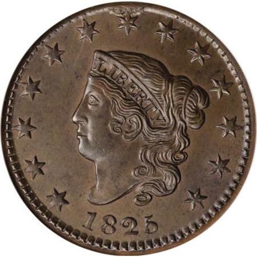 <B>1825 1C MS64 Brown NGC.</B></I> N-10, High R.3. Noyes Die State C with a die break or "cud" above star 7. A lustrous chocolate-brown to medium brown Matron Head example. Crisply struck save for the left-side stars. Slightly bright near star 5, and a few unimportant marks are noted above the E in CENT. EAC 62.<BR><BR><B>Coin Engraver:</B> Robert Scot or John Reich<BR><BR><b>Shipping:</b> Coins & Currency (<a target="_blank" href="http://www.heritageauctions.com/common/shipping.php">view shipping information</a>)