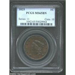 1825 1C MS65 Brown PCGS. Sharply struck in the centers, each side is glossy with variegated medium t