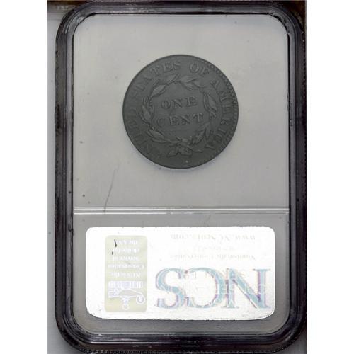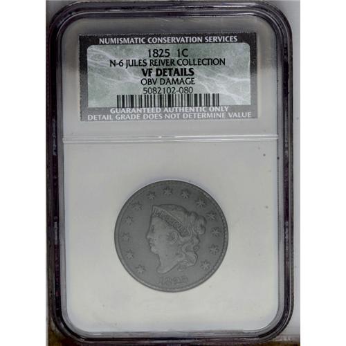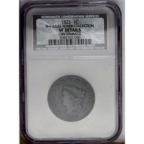 <B>1825<1C> N-6, R.3--Obverse Damage--NCS. VF Details. Fine 12 EAC.</B></I> Middle Die State. A couple of punches are noted on Liberty's neck, and another in the hair at the top of the head. A double profile is visible on the left side of Liberty's portrait. Each side is blanketed in chocolate-brown patination.<BR><I>Ex: Dr. Kenneth J. Sartoris; Del Bland (5/21/1972).</B></I> Envelope Included.