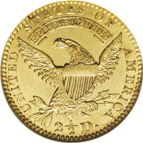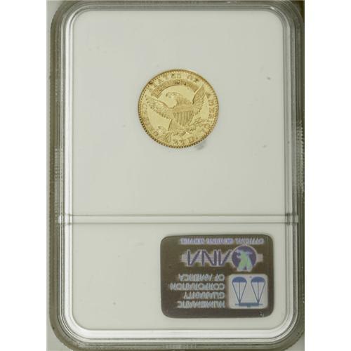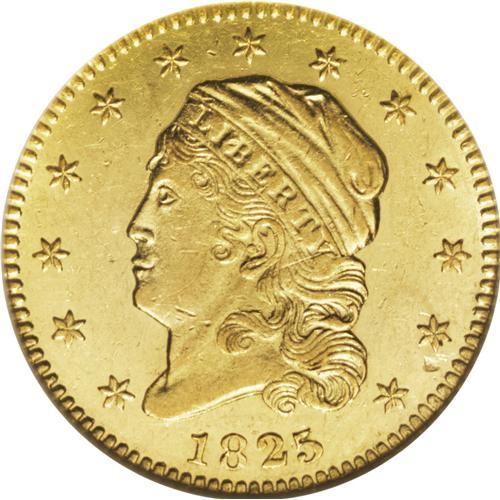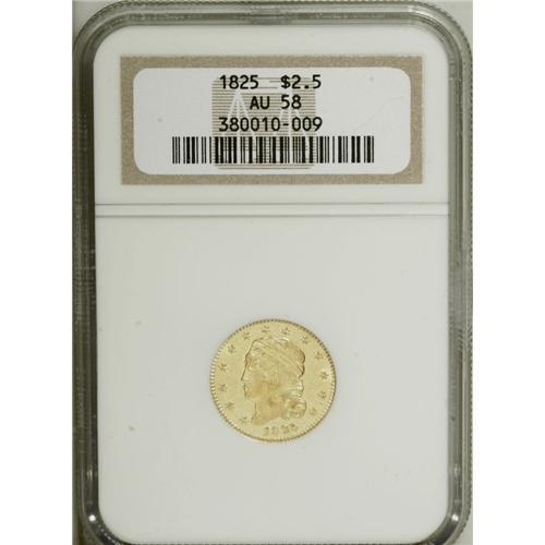 <B>1825 $2 1/2 AU58 NGC.</B></I> Breen-6129, BD-3, High R.6. Although the 1825 has a tiny emission of only 4,434 pieces, three die marriages are known. BD-2 is the usual variety, and shares the same obverse with BD-3, but the latter has a different reverse promptly identified by the location of the second T in STATES, which is directly centered above the I in PLURIBUS. This T-I attribution rule is applicable to many denominations from the 1820s, and is an unintended gift by engraver John Reich to later generations of numismatists. This attractive piece is bright yellow-gold and retains a goodly portion of its initial mint luster. The strike is good, and there are no distracting marks.<BR><BR><b>Shipping:</b> Coins & Currency (<a target="_blank" href="http://www.heritageauctions.com/common/shipping.php">view shipping information</a>)