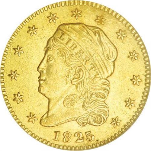 <B>1825 $2 1/2 AU58 NGC.</B></I> Breen-6128, BD-2, High R.4. The 5 in the date leans left, is slightly lower than the 2, and is repunched. Of the three recognized die marriages for the 1825 quarter eagle, this is the most commonly seen. Bass and Dannreuther's <I>Early U.S. Gold Coin Varieties </B></I>(2006) includes an estimated mintage (for this variety) of 2,000 to 3,000 coins, from a total mintage for the date of 4,434 pieces. Of that number, however, only 80 to 100 examples of the BD-2 are currently known to survive. This piece is well struck with pleasing green-gold coloration and slight, even wear across the design's highpoints. A few trivial contact marks are scattered over each side. <I> </B></I><BR><BR><B>Coin Engraver:</B> John Reich<BR><BR><b>Shipping:</b> Coins & Currency (<a target="_blank" href="http://www.heritageauctions.com/common/shipping.php">view shipping information</a>)