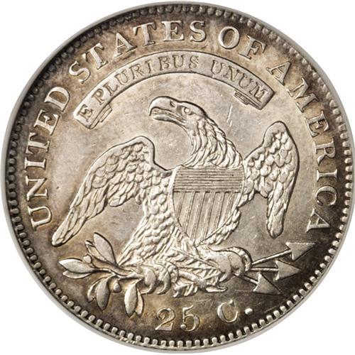 <B>1825/2 25C AU53 NGC.</B></I> B-1, R.5. The rare Browning-1 quarter, identified by the high location of star 8 relative to the cap. B-1 receives a separate <I>Guide Book</B></I> listing, as it is an 1825/2 overdate, while B-2 and B-3 are variously described as 1825/4, 1825/3, and 1825/4/3. This example has chestnut-gold and steel-blue toning. The reverse offers substantial luster, and the surfaces are clean despite a thin mark near Liberty's nose.<BR><I>From The Southland Collection.</B></I><BR><BR><b>Shipping:</b> Coins & Currency (<a target="_blank" href="http://www.heritageauctions.com/common/shipping.php">view shipping information</a>)