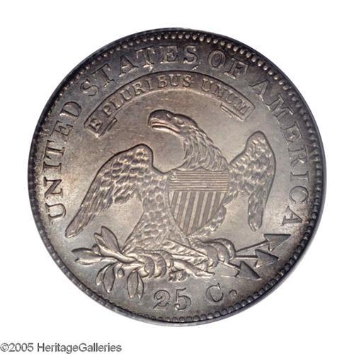 <B>1825/2<25C> AU58 PCGS.</B></I> B-1, R.5. Browning-1 is easily the rarest of the three 1825-dated die marriages, and it receives a separate <I>Guide Book</B></I> listing, as it is the only 1825/2 variety. The other two die pairings share a common 1825/4/3 obverse. The present boldly struck near-Mint example has only delicate sky-gray and gold tints on the obverse, the reverse has a peach center bounded by lighter cream toning. Unmarked for the grade, the obverse is somewhat prooflike, the reverse displays extensive cartwheel shimmer. The dies are lightly clashed but otherwise perfect. A significant offering for the specialist. Population: 4 in 58, 2 finer (10/05).