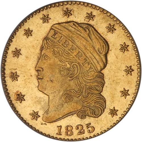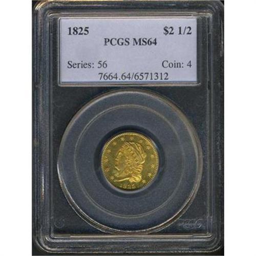 <b>1825 $2.50 Capped Head. PCGS graded MS64.</b> Beautiful greenish yellow gold luster with considerable reflective prooflike character. Minor hairlines and other abrasions are noted, but so few and inconsequential that they barely register on the eye; there are no rim problems whatsoever. This date historically has been described rare. In fact, the 1825 is about as rare as the 1821 or 1824 dates in Mint condition. By that we mean that there are very few that have been certified.
