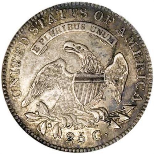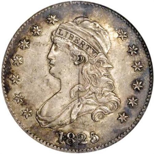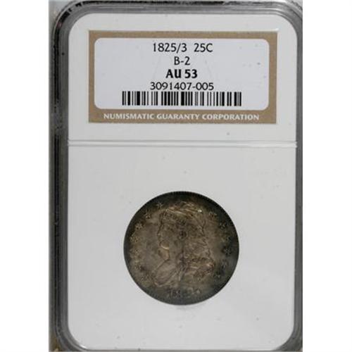<B>1825/4/3 25C AU53 NGC.</B></I> B-2, R.2. Attractively toned in medium russet, tan, and steel-gray shades that deepen slightly toward the rims. Richly detailed and distraction-free. NGC refers to this variety as 1825/3, and the Guide Book calls it an 1825/4. Likely, both underdigits are present.<BR><BR><B>Coin Engraver:</B> John Reich<BR><BR><b>Shipping:</b> Coins & Currency (<a target="_blank" href="http://www.heritageauctions.com/common/shipping.php">view shipping information</a>)