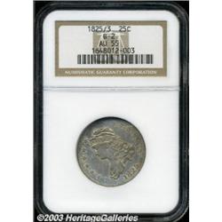 1825/3 25C AU55 NGC. B-2, Low R.2. Very well struck beneath pale shades of dappled antique-golden toning. Considerable luster survives in the protected areas and a matched pair of tiny, ancient digs are noted in the left obverse field. Important notice: Heritage usually auctions material at the rate of 200-250 lots per hour. On some occasions eBay Live bid software or the Internet may not be able to keep up with the pace of the auction. We recommend placing a realistic absentee bid now as insurance to avoid disappointment. Occasionally the auctioneer may eliminate or reject an eBay Live bid, and the auctioneer may also reopen a lot after the close of the eBay live bidding (usually because we missed an audience bid), and may reject your bid even if it shows you as the winning bidder. By bidding via eBay Live, you agree that Heritage may award the lot to another bidder at its sole discretion under the circumstances described above or any other reasonable circumstances. Also please note that all Heritage lots purchased through eBay Live carry a 20% Buyer's Premium. Please make sure you read the Terms and Conditions before you bid.