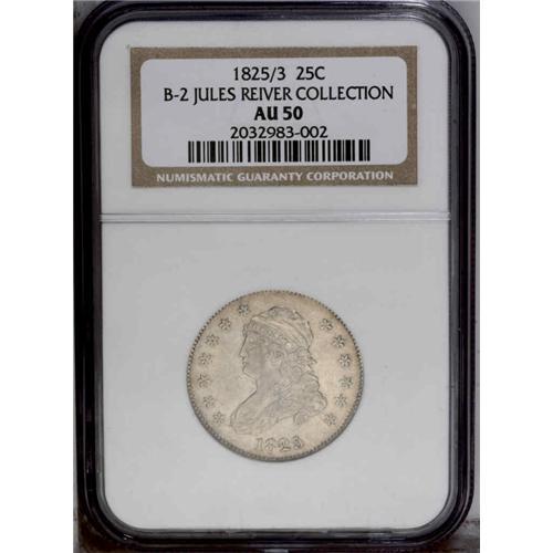 <B>1825/3<25C> B-2, R.2. AU50 NGC. Die State III.</B></I> Close overdate; High 25 with small 5. Bright and lustrous in the protected areas. Excellent surfaces that show no bangs or bumps from circulation, just the usual scattered scuffs and a trivial scratch or two. Later die state on the reverse with a crack from the rim through the left side of the I in UNITED nearly to the eagle's wing and a crack forming which connects the three arrowheads. A very desirable specimen.<BR><I>Ex: Evans (8/1991).</B></I> Envelope Included.