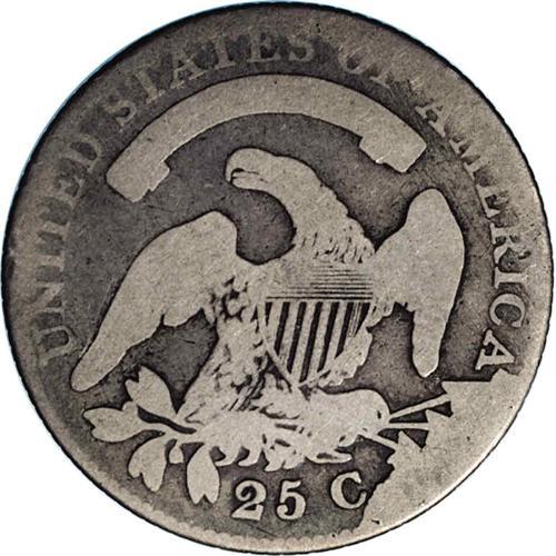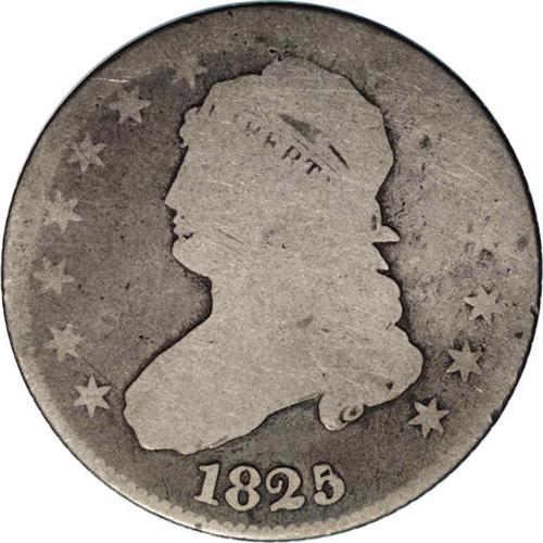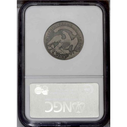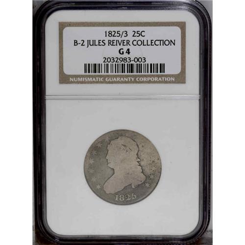 <B>1825/3<25C> B-2, R.2. Good 4 NGC. Terminal Die State.</B></I> Close overdate; High 25 with small 5. Here is a great collector coin, the fields are dark gray while the devices are lighter silver. No significant surface distractions are found. There is a full reverse die cud from just past the C of the denomination through the three arrowheads nearly to the final A of AMERICA. Expect considerable attention when this one crosses the auction block as these terminal die states are always very popular with collectors.<BR><I>Ex: Julian Leidman (12/1997).</B></I> Envelope Included.