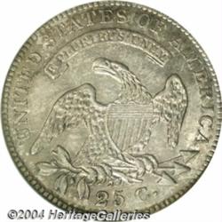 <table><tr><td><table><tr><td>1825/3 25C E Countermark AU58 ANACS. B-2, R.2. Apple-green, tan, and gunmetal-gray patina enriches this sharply struck piece. The luster is extensive and the surfaces are lightly abraded. Certain relatively high grade 1815 and 1825/3 Capped Bust quarters display E and L countermarks at 12 o'clock. The meaning of these countermarks is speculative, but Karl Moulton, who has been studying these pieces for quite some time, asserts that the first example, an 1815, appeared in Captain John W. Haseltine's December 12, 1881 sale. Although these pieces were absent from earlier numismatic circles, they suddenly flooded auctions throughout 1882 and 1883. Moulton believes that the death of William DuBois in July 1881 may be connected to the sudden appearance of these pieces. DuBois had served as Assayer at the Philadelphia Mint and also as curator of the Mint Collection. It is possible that the countermarked 1815 and 1825/3 quarters were dispersed to prominent dealers following DuBois' death. While it is obvious that the E and L counterstamps were added to the coins sometime after striking, it is unknown whether the letters were impressed at the Mint. All of the countermarked 1825 quarters are of the 1825/3 B-2 die variety. <BR><BR><B>Important notice:</B> Heritage usually auctions material at the rate of 200-250 lots per hour. On some occasions eBay Live bid software or the Internet may not be able to keep up with the pace of the auction. We recommend placing a realistic absentee bid now as insurance to avoid disappointment. Occasionally the auctioneer may eliminate or reject an eBay Live bid, and the auctioneer may also reopen a lot after the close of the eBay live bidding (usually because we missed an audience bid), and may reject your bid even if it shows you as the winning bidder. By bidding via eBay Live, you agree that Heritage may award the lot to another bidder at its sole discretion under the circumstances described above or any other reasonable circumstances. Since eBay bids are not shown to us until we open the lot on the floor, we treat those bids just like floor bids. In most cases the floor responds before the eBay bid is presented to us, due to Internet lag time, so for consistency we have made it a policy that floor bids are always considered first over tie eBay live bids. Also please note that all Heritage lots purchased through eBay Live carry a 20% Buyer's Premium. Please make sure you read the Terms and Conditions before you bid. <BR><BR><B>IMPORTANT ANNOUNCEMENT ABOUT RESERVES:</B> Heritage now divulges all reserves on its web site 7 days before every auction. If you want to know whether the reserve on this lot has been met, and if not, what the reserve amount is, please visit this lot page on the HeritageCoin.com web site, or email: bid@HeritageGalleries.com </span></font></td></tr></table></td></tr></table>