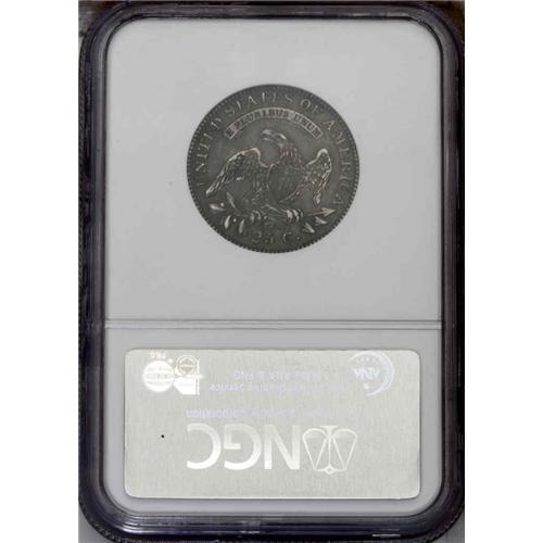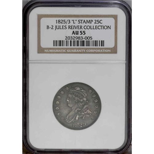 <B>1825/3<25C> "L" Counterstamp B-2, R.5. AU55 NGC. Die State I.</B></I> Close overdate; High 25 with small 5. A well struck but rather darkly toned coin. The obverse and reverse surfaces only show two or three scattered contact abrasions. The overdate feature is faint but noticeable, under slight magnification. Minimal highpoint wear defines the grade of the piece. Many theories have been put forth about these enigmatic counterstamps, but to date none have been proven based on any documentation from the period. Always popular with collectors who love to speculate on the true meaning of what the E and L may have stood for.<BR><I>Ex: Steve Ivy (10/1983).</B></I> Envelope Included.