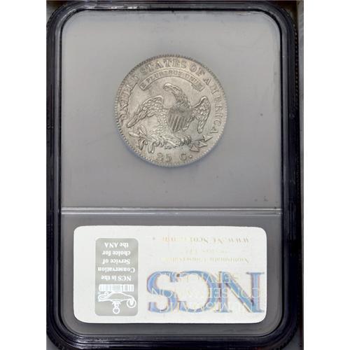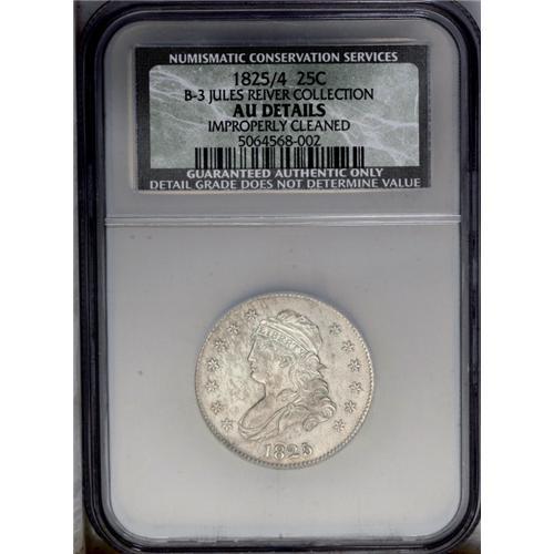 <B>1825/4<25C> B-3, R.3--Improperly Cleaned--NCS. AU Details. Die State V.</B></I> Close overdate; Low 25 with large 5. This coin barely circulated but was cleaned leaving the luster dull and the surfaces retain traces of shadowy gold. Boldly struck by the dies, with sharp stars on the obverse and we note rim crumbling most of the upper stars on the left, and faint die cracks through the stars. The reverse though, is where the action is with cracks extending to the rims through the base of UNITED and this area has formed a retained cud. An impressive coin that shows strong definition on the die cracks. Each side presents a dull gray appearance with subtle tan accents on the obverse.<BR><I>Ex: Hairfield (12/1983).</B></I> Envelope Included.