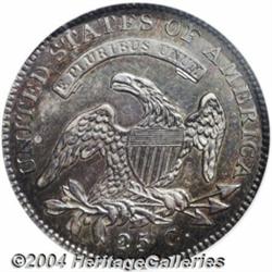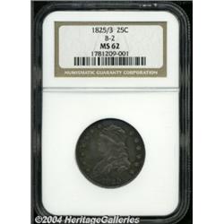 <B>1825/4/3<25C> MS62 NGC.</B></I> B-2, R.2. Fragments of an underlying 3 are quite evident beneath the 5, using magnification. Quite attractive from the standpoint of originality, both sides show intense golden-brown, charcoal-green, and cobalt-blue iridescence over well delineated features. Sharply struck with few contact marks for the grade. Population: 3 in 62, 6 finer (6/04). <BR><BR><B>Important notice:</B> Heritage usually auctions material at the rate of 200-250 lots per hour. On some occasions eBay Live bid software or the Internet may not be able to keep up with the pace of the auction. We recommend placing a realistic absentee bid now as insurance to avoid disappointment. Occasionally the auctioneer may eliminate or reject an eBay Live bid, and the auctioneer may also reopen a lot after the close of the eBay live bidding (usually because we missed an audience bid), and may reject your bid even if it shows you as the winning bidder. By bidding via eBay Live, you agree that Heritage may award the lot to another bidder at its sole discretion under the circumstances described above or any other reasonable circumstances. Since eBay bids are not shown to us until we open the lot on the floor, we treat those bids just like floor bids. In most cases the floor responds before the eBay bid is presented to us, due to Internet lag time, so for consistency we have made it a policy that floor bids are always considered first over tie eBay live bids. Also please note that all Heritage lots purchased through eBay Live carry a 20% Buyer's Premium. Please make sure you read the Terms and Conditions before you bid. </span></font></tr></table></td></tr></table>
