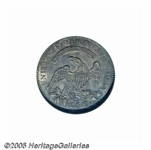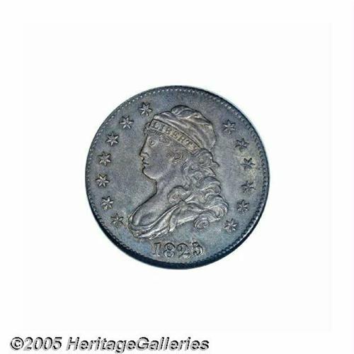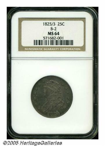 <B>1825/4/3<25C> MS64 NGC.</B></I> B-2, R.2. This variety has traditionally been known as 1825 over 3, and is from the same obverse die as the "1825 over 4" variety, which is cataloged as Browning-3. This particular coin shows the upright of the 4 above the curve in the 5, and it also displays the upper curve of the 3. A scarce and popular date among Bust quarters, surprisingly there are a number of Uncirculated examples known of this issue. NGC has certified two others in MS64 and four finer, while PCGS has graded 18 with seven finer (5/05). This is a sharply struck coin whose surfaces are covered in deep gray toning with subtle undertones of rose and lilac. A pleasing, minimally abraded example of this important quarter.