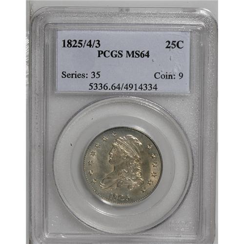 <B>1825/4/3<25C> MS64 PCGS.</B></I> B-2, R.2. This shimmering near-Gem is delicately toned in tan-gold hues. Luster is unencumbered, since neither side exhibits any remotely mentionable marks. The strike is exacting for the type, and the eye appeal is obvious. All three 1825-dated varieties are overdates, although what underdigit (or underdigits) may lurk beneath the 5 is a subject for debate. Browning-2 is readily attributed. Star eight is placed low, and 25C is entered high.<BR><I>Ex: Rarities Sale (Bowers and Merena, 9/02), lot 241.</B></I>