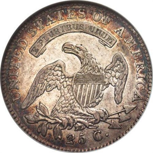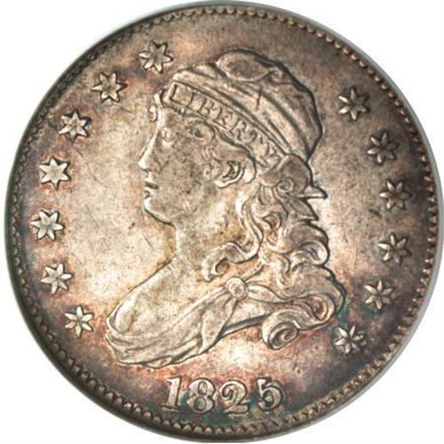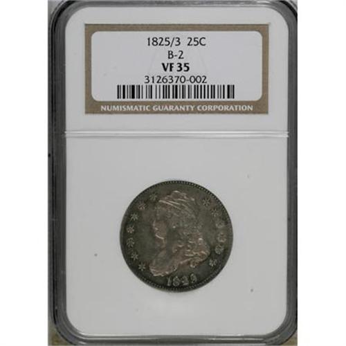 <B>1825/4/3 25C VF35 NGC.</B></I> B-2, R.2. Star 8 is low, while 25 C is high. Orange-gold, electric-blue, and purple toning clings to the margins, yielding to golden-gray centers. Nice remaining detail, though the stars along the left border are somewhat weak. No marks beyond what would be expected for a coin seeing light to moderate circulation.<BR><BR><B>Coin Engraver:</B> John Reich<BR><BR><b>Shipping:</b> Coins & Currency (<a target="_blank" href="http://www.heritageauctions.com/common/shipping.php">view shipping information</a>)