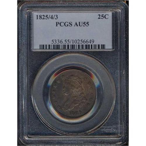 <b>1825/4/3 Capped Bust Quarter Dollar, B-3. PCGS graded AU55.</b> Deep gunmetal gray surfaces replete with smooth characteristics and very few handling marks. The main features, while not 100% crisply defined, are about average for this interesting die variety. Ideally suited for a 19th century Type set <b>(PCGS # 5336)</b>