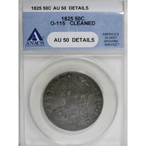 <B>1825 50C --Cleaned--ANACS. AU50 Details.</B></I> O-115. NGC Census: (44/1638). PCGS Population (80/527). Mintage: 2,900,000. Numismedia Wsl. Price for NGC/PCGS coin in AU50: $225. (#6142)<BR><BR><B>Coin Engraver:</B> John Reich<BR><BR><b>Shipping:</b> Coins & Currency (<a target="_blank" href="http://www.heritageauctions.com/common/shipping.php">view shipping information</a>)