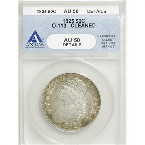<B>1825 50C --Cleaned--ANACS. AU50 Details.</B></I> O-113. NGC Census: (44/2409). PCGS Population (80/534). Mintage: 2,900,000. Numismedia Wsl. Price for NGC/PCGS coin in AU50: $225. (#6142)<BR><BR><B>Coin Engraver:</B> John Reich<BR><BR><b>Shipping:</b> Coins & Currency (<a target="_blank" href="http://www.heritageauctions.com/common/shipping.php">view shipping information</a>)