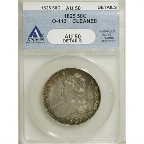 <B>1825 50C --Cleaned--ANACS. AU50 Details.</B></I> O-113. NGC Census: (44/611). PCGS Population (83/538). Mintage: 2,900,000. Numismedia Wsl. Price for NGC/PCGS coin in AU50: $325. (#6142)<BR><BR><B>Coin Engraver:</B> John Reich<BR><BR><b>Shipping:</b> Coins & Currency (<a target="_blank" href="http://www.heritageauctions.com/common/shipping.php">view shipping information</a>)
