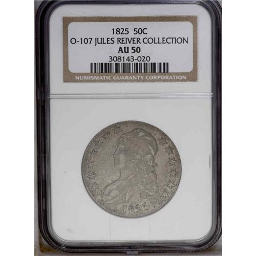 <B>1825<50C> AU50 NGC.</B></I> O-107, R.2. MER in AMERICA is joined at the base, and the 5 in the date leans left. A crisply struck example with faint highpoint wear and natural light, dappled coloration. There are one or two wispy pinscratches on each side, but the surfaces are generally very clean for the grade. Envelope Included.