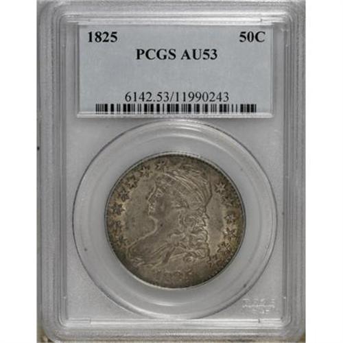 <B>1825 50C AU53 PCGS.</B></I> PCGS Population (57/488). NGC Census: (44/566). Mintage: 2,900,000. Numismedia Wsl. Price for NGC/PCGS coin in AU53: $375. (#6142)<BR><BR><B>Coin Engraver:</B> John Reich<BR><BR><b>Shipping:</b> Coins & Currency (<a target="_blank" href="http://www.heritageauctions.com/common/shipping.php">view shipping information</a>)