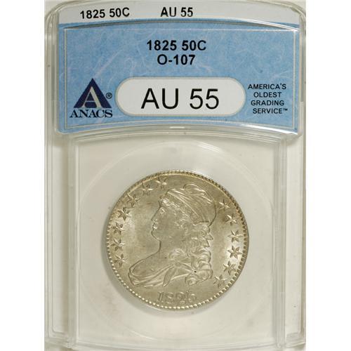 <B>1825 50C AU55 ANACS.</B></I> O-107. NGC Census: (90/447). PCGS Population (108/327). Mintage: 2,900,000. Numismedia Wsl. Price for NGC/PCGS coin in AU55: $283. (#6142)<BR><BR><b>Shipping:</b> Coins & Currency (<a target="_blank" href="http://www.heritageauctions.com/common/shipping.php">view shipping information</a>)