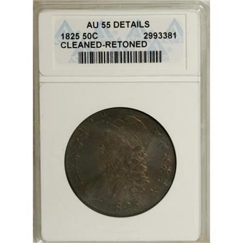 <B>1825 50C --Cleaned, Retoned--ANACS. AU55 Details.</B></I> NGC Census: (92/454). PCGS Population (113/342). Mintage: 2,900,000. Numismedia Wsl. Price for NGC/PCGS coin in AU55: $283. (#6142)<BR><BR><B>Coin Engraver:</B> John Reich<BR><BR><b>Shipping:</b> Coins & Currency (<a target="_blank" href="http://www.heritageauctions.com/common/shipping.php">view shipping information</a>)