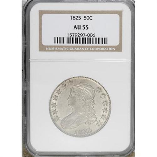<B>1825 50C AU55 NGC.</B></I> NGC Census: (97/2275). PCGS Population (119/361). Mintage: 2,900,000. Numismedia Wsl. Price for NGC/PCGS coin in AU55: $450. (#6142)<BR><BR><B>Coin Engraver:</B> John Reich<BR><BR><b>Shipping:</b> Coins & Currency (<a target="_blank" href="http://www.heritageauctions.com/common/shipping.php">view shipping information</a>)