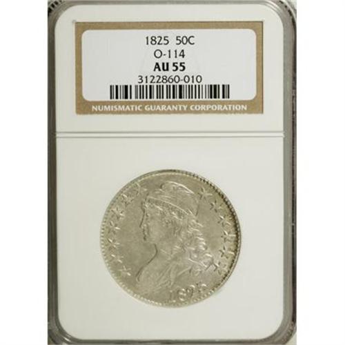<B>1825 50C AU55 NGC.</B></I> O-114, R.1. A stone-white and impressively detailed silver type coin that lacks consequential field marks. O-114 is identified by the date, which features a recut, right-leaning 1.<BR><BR><B>Coin Engraver:</B> John Reich<BR><BR><b>Shipping:</b> Coins & Currency (<a target="_blank" href="http://www.heritageauctions.com/common/shipping.php">view shipping information</a>)