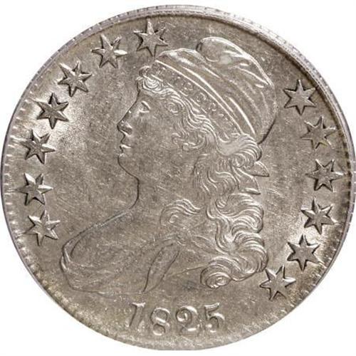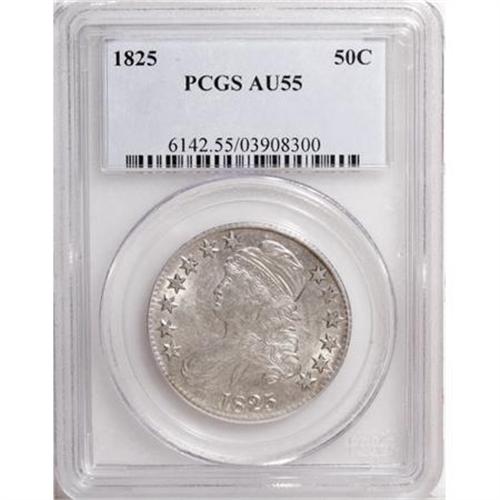 <B>1825 50C AU55 PCGS.</B></I> PCGS Population (119/361). NGC Census: (97/2268). Mintage: 2,900,000. Numismedia Wsl. Price for NGC/PCGS coin in AU55: $283. (#6142)<BR><BR><B>Coin Engraver:</B> John Reich<BR><BR><b>Shipping:</b> Coins & Currency (<a target="_blank" href="http://www.heritageauctions.com/common/shipping.php">view shipping information</a>)