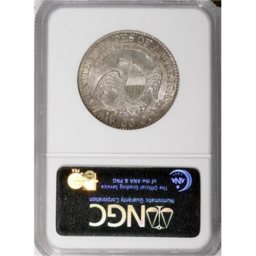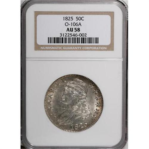 <B>1825 50C AU58 NGC.</B></I> O-106A. NGC Census: (181/2087). PCGS Population (128/233). Mintage: 2,900,000. Numismedia Wsl. Price for NGC/PCGS coin in AU58: $600. (#6142)<BR><BR><B>Coin Engraver:</B> John Reich<BR><BR><b>Shipping:</b> Coins & Currency (<a target="_blank" href="http://www.heritageauctions.com/common/shipping.php">view shipping information</a>)
