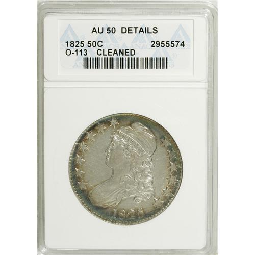 <B>1825 50C --Cleaned--ANACS. AU50 Details.</B></I> O-113. NGC Census: (42/575). PCGS Population (75/484). Mintage: 2,900,000. Numismedia Wsl. Price: $225. (#6142)<BR><BR><b>Shipping:</b> Coins & Currency (<a target="_blank" href="http://www.heritageauctions.com/common/shipping.php">view shipping information</a>)