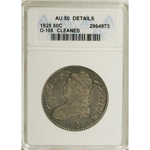 <B>1825 50C --Cleaned--ANACS. AU50 Details.</B></I> O-105. NGC Census: (42/579). PCGS Population (75/481). Mintage: 2,900,000. Numismedia Wsl. Price for NGC/PCGS coin in AU50: $225. (#6142)<BR><BR><b>Shipping:</b> Coins & Currency (<a target="_blank" href="http://www.heritageauctions.com/common/shipping.php">view shipping information</a>)