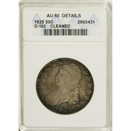 <B>1825 50C --Cleaned--ANACS. AU50 Details.</B></I> O-103. NGC Census: (42/581). PCGS Population (75/481). Mintage: 2,900,000. Numismedia Wsl. Price for NGC/PCGS coin in AU50: $225. (#6142)<BR><BR><b>Shipping:</b> Coins & Currency (<a target="_blank" href="http://www.heritageauctions.com/common/shipping.php">view shipping information</a>)