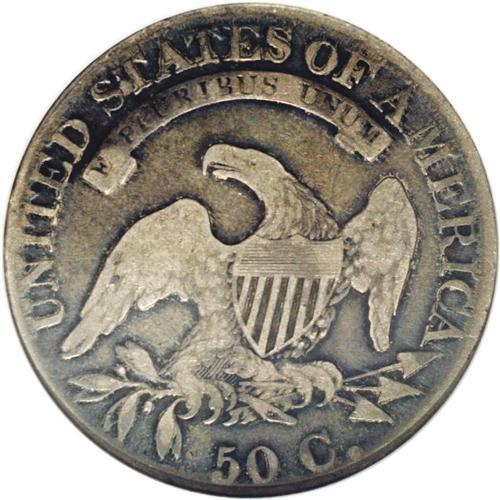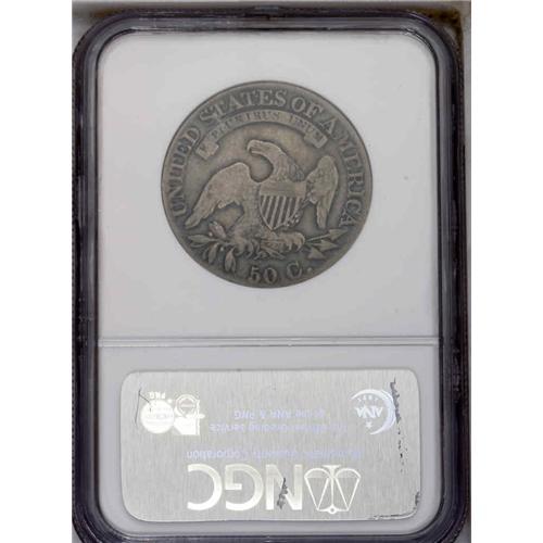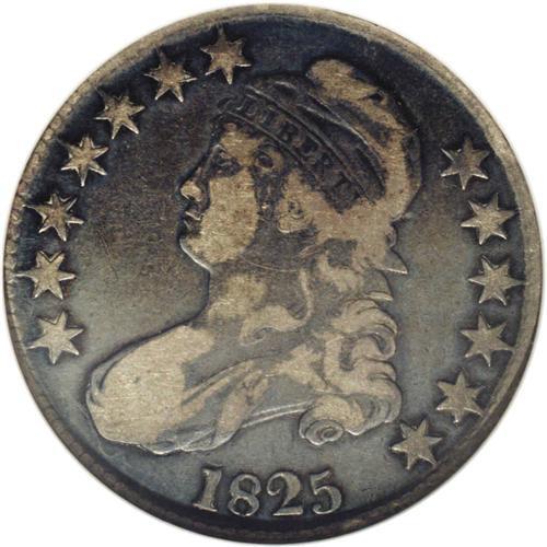 <B>1825<50C> Fine 12 NGC.</B></I> O-109, R.5. The 8 and 2 are close on this variety, with a long, sharp point on the loop of the 2. On the reverse TAT, AMERI, and CA are close at their bases. The present example is dark, with pinkish-gray highpoints. Advanced die erosion has drawn the star points to the edge, as well as the reverse legends. Perusal with a glass reveals only light scrapes in the obverse left (facing) field. Envelope Included.