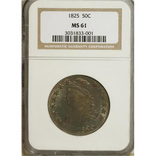 <B>1825 50C MS61 NGC.</B></I> O-111, R.3. Dramatic recutting of the denomination establishes the variety identification of O-111. A lovely Mint State piece, this half dollar shows full satiny luster with pastel gold and sea-green toning. <BR><BR><B>Coin Engraver:</B> John Reich<BR><BR><b>Shipping:</b> Coins & Currency (<a target="_blank" href="http://www.heritageauctions.com/common/shipping.php">view shipping information</a>)