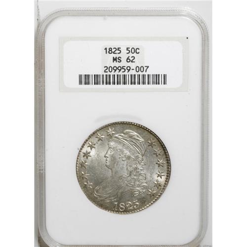 1825 50C MS62 NGC. O-111, R.3. Heavy repunching on the