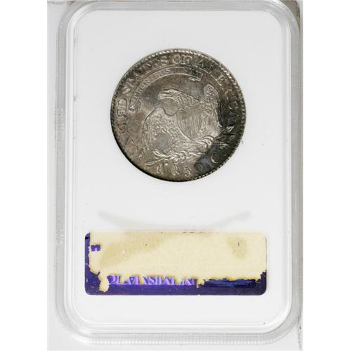 <B>1825<50C> MS62 NGC.</B></I> O-111, R.3. Heavy repunching on the reverse solidifies the attribution. Nicely struck with pleasing luster overall, though the light golden patina that covers the obverse gives way to an arc of darker toning that encompasses most of the denomination and the arrowheads.