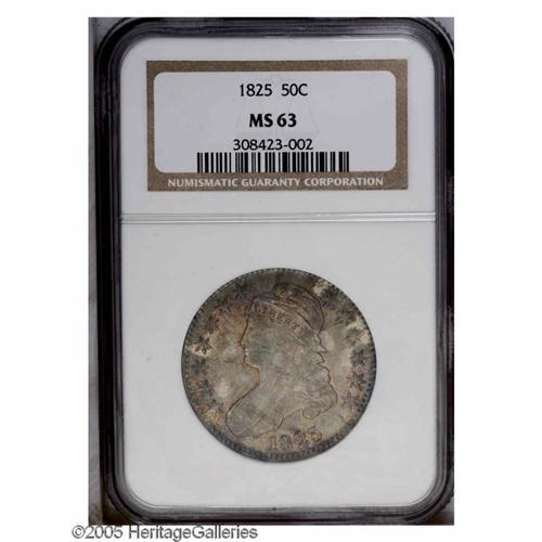 <B>1825<50C> MS63 NGC.</B></I> O-102, R.1. Vibrant sea-green and rose-gold colors bathe this lustrous and undisturbed representative. The strike is crisp, albeit not absolute on the claws, curls, and stars. Liberty's profile is strike doubled.<BR><I>From The Albert E. Willis Collection.</B></I>