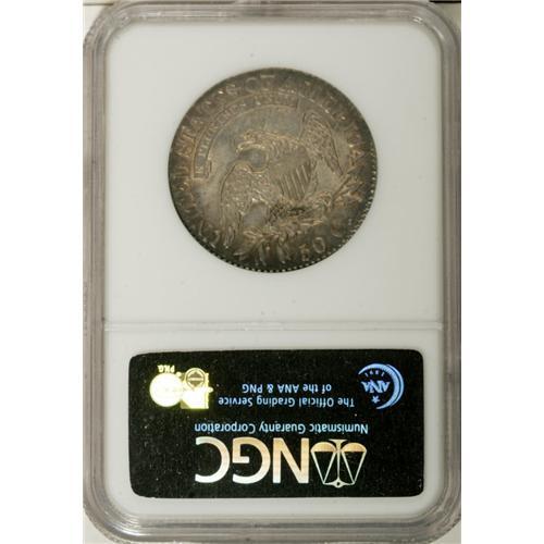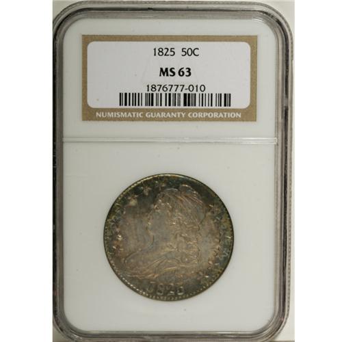 <B>1825 50C MS63 NGC.</B></I> O-114, R.1. This die combination ranks among the most plentiful of all 1825 half dollar varieties, although no Gem quality examples have been offered in recent auctions. There are possibly two or three Gems in private collections, but nearly all pieces that have been offered in that past few years are in MS64 or lower grades. This Select Mint State representative is fully lustrous with satiny silver surfaces beneath pale gold, sky-blue, and iridescent toning.<BR><I>From The Rocky Top Collection of Bust Half Dollars.</B></I><BR><BR><b>Shipping:</b> Coin/Currency (<a target="_blank" href="http://www.heritageauctions.com/common/shipping.php">view shipping information</a>)