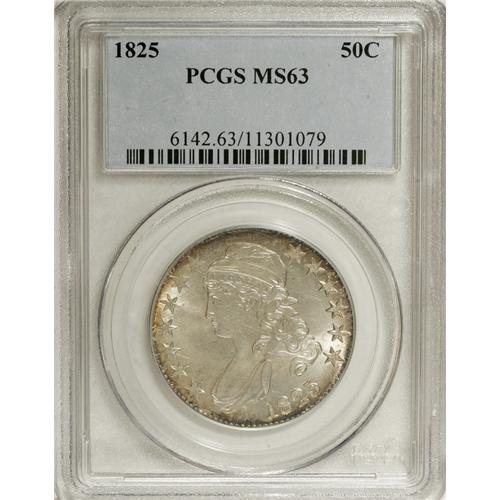 <B>1825 50C MS63 PCGS.</B></I> O-106a, R.3. The recut flag of the 5 in the date is diagnostic for the variety. Light golden-brown patina graces the obverse border and visits the reverse center. This lustrous piece lacks mentionable marks, and the strike is attentive despite some softness on the stars and the eagle's right (facing) claw.<BR><I>From The Hoosier Discovery Collection.</B></I><BR><BR><b>Shipping:</b> Coins & Currency (<a target="_blank" href="http://www.heritageauctions.com/common/shipping.php">view shipping information</a>)