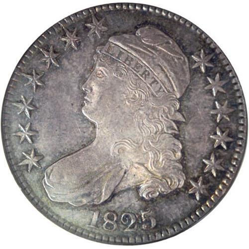 <B>1825 50C MS64 NGC.</B></I> O-102, R.1. The mildly prooflike obverse is lavishly toned in electric-blue and rose tints that transform into deep gray colors when the piece is rotated beneath a light. The reverse is satiny, and richly patinated in navy-blue, peach, and olive colors. Meticulously struck, and small marks are found only on concealed portions of the cap and drapery. Liberty's profile is moderately strike doubled.<BR><I>From The Westmoreland, Virginia Collection.</B></I>