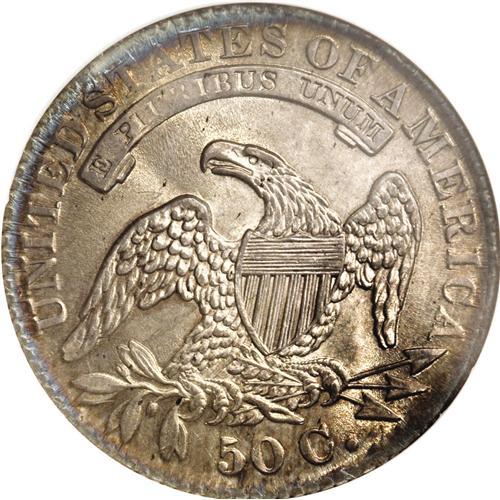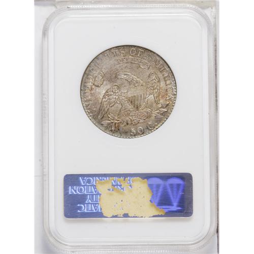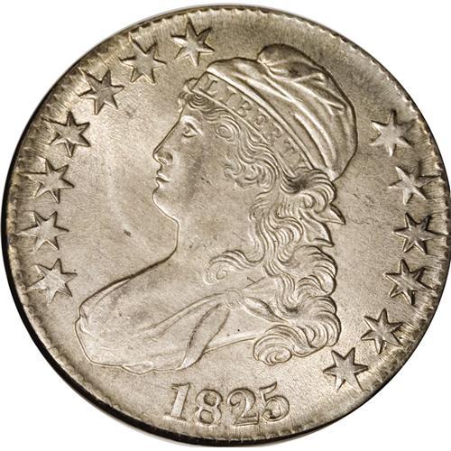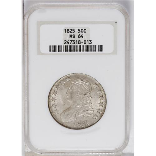 <B>1825<50C> MS64 NGC.</B></I> O-113, R.1. This attractive near-Gem boasts cream-gray surfaces with tinges of orange and rose across portions of the reverse. This satiny, original specimen has uncommonly smooth surfaces and is well struck on the major devices, while the stars have flat centers and the RI in PLURIBUS is faint, as often seen. Liberty's nose is strike-doubled. A beautiful coin, one whose impressive preservation makes a prize from the technical perspective, as well as the aesthetic.