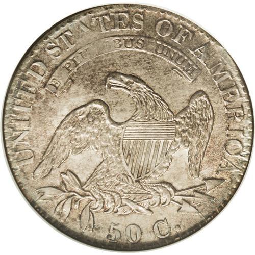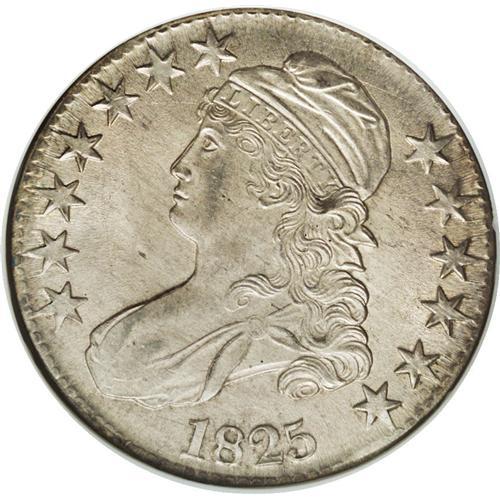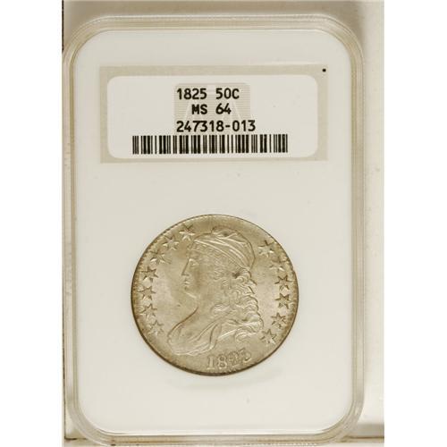 <B>1825 50C MS64 NGC.</B></I> O-113, R.1. This attractive near-Gem boasts cream-gray surfaces with tinges of orange and rose across portions of the reverse. This satiny, original specimen has uncommonly smooth surfaces and is well struck on the major devices, while the stars have flat centers and the RI in PLURIBUS is faint, as often seen. Liberty's nose is strike-doubled. A beautiful coin, one whose impressive preservation makes a prize from the technical perspective, as well as the aesthetic.<BR><BR><b>Shipping:</b> Coin/Currency (<a target="_blank" href="http://www.heritageauctions.com/common/shipping.php">view shipping information</a>)