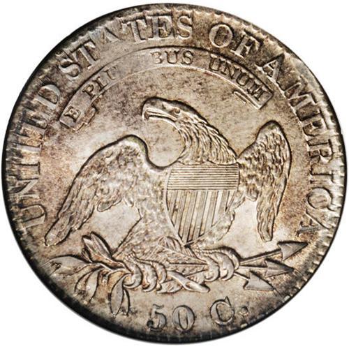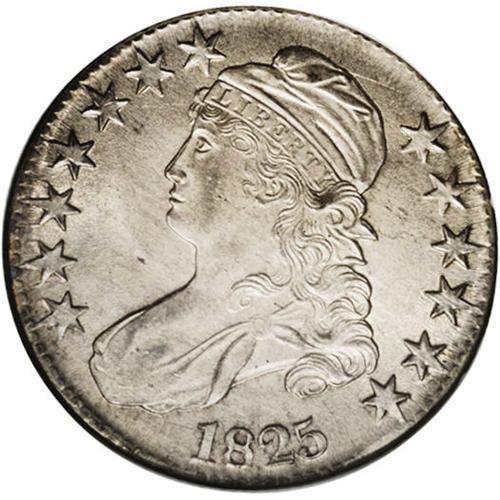 <B>1825<50C> MS64 NGC.</B></I> O-115, R.3. Cream-gray in color with tinges of orange and rose toning across portions of the reverse. A satiny and original near-Gem with uncommonly smooth surfaces. Well struck on the major devices, while the stars have flat centers and the RI in PLURIBUS is faint, as often seen. Liberty's nose is strike doubled. A beautiful coin, and the impressive preservation makes it a prize from the technical perspective, as well.